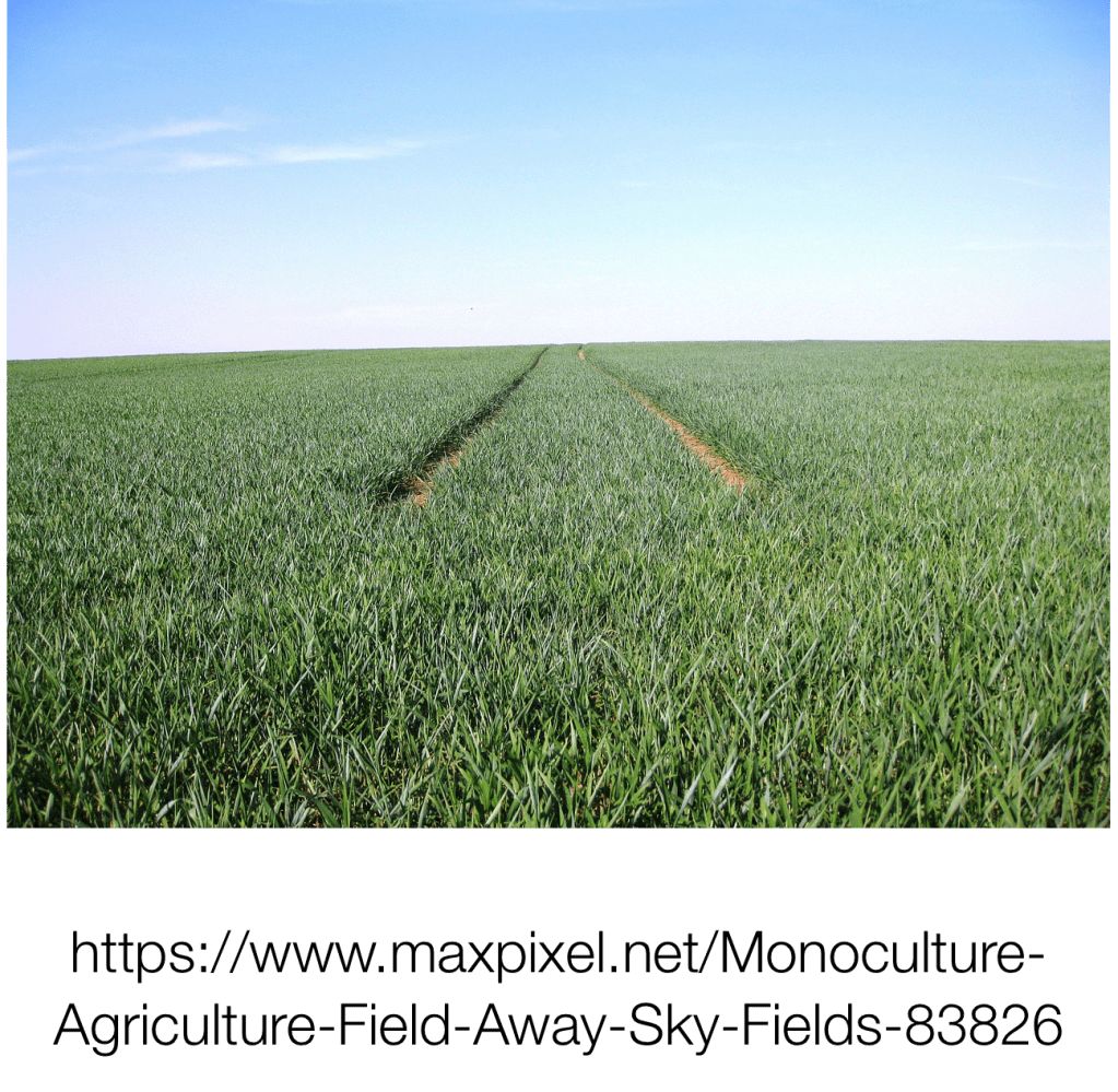 In a drive to be more productive and more economic, many agricultural businesses have gone for the large scale – large farms, large fields, large machinery – creating landscapes that devoid of trees and hedges and instead are vast tracts of identical crops. Monoculture does not support biodiversity. Fields of rape may provide near endless quantities of flowers that are attractive to pollinators, but once they have flowered there is a dearth of food sources for those pollinators. With their demise, comes the demise of other birds and animals that rely on them as part of the food chain.