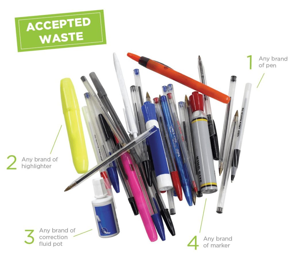 Pens can be recycled at Ryman stores who participate in the Terra Cycle scheme. This includes all writing instruments (except for wooden pencils and chalk) are accepted : Any brand of pen, felt tip, highlighter, marker, correction fluid pot, correction tape, mechanical pencil and eraser pen regardless of their composition.