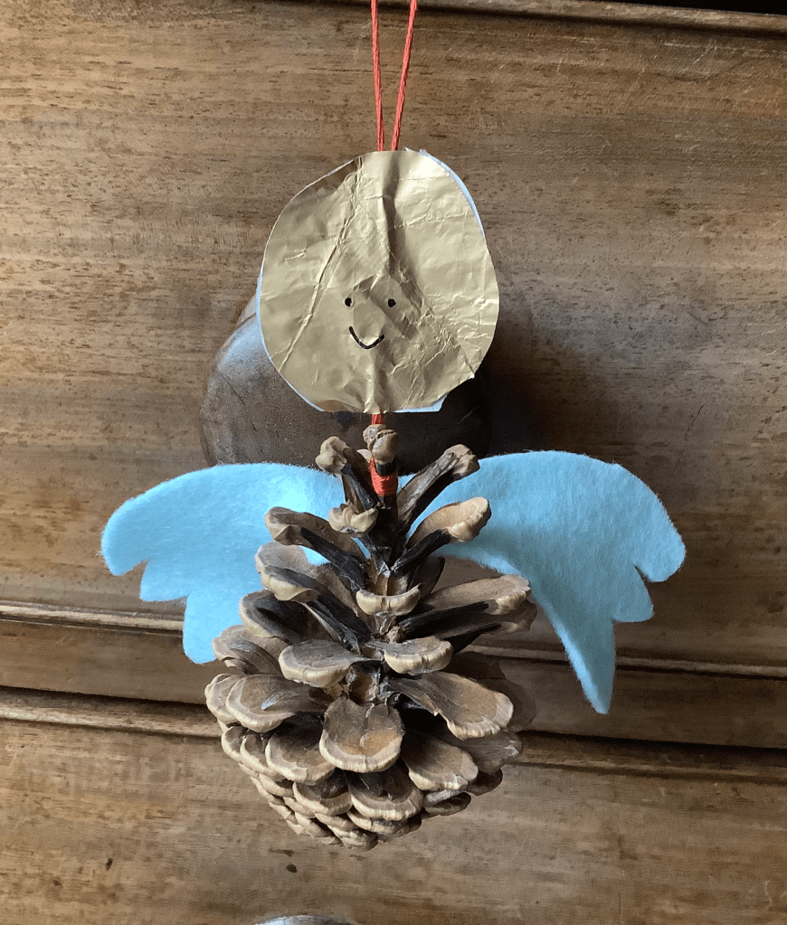 A pine cone angel: made from a pine cone, a gold paper/ thin card face all strung together with embroidery silk, and with wings made from felt and wedged into place (glue could be used for extra security).
