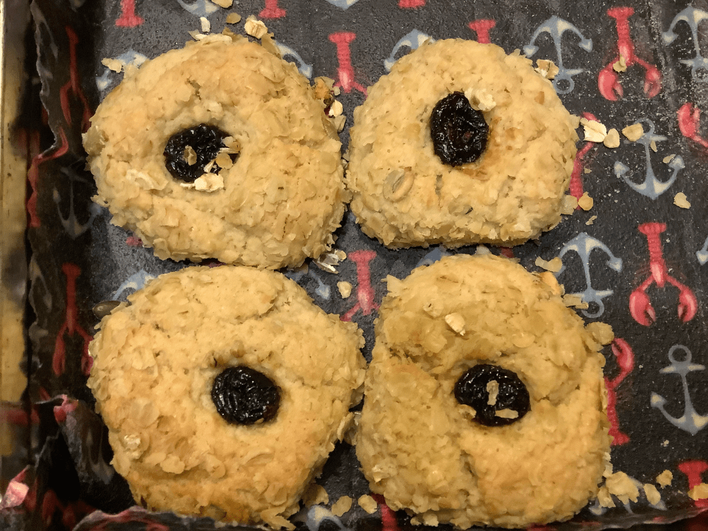Take teaspoons of the mixture and gently squeeze into a round ball and roll in the porridge oats. Place onto a greased baking tray. Flatten slightly and press a cranberry/ cherry into the middle.