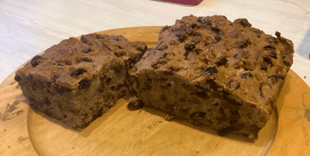 Rub butter into flour. Add nutmeg and egg replacement powder, sugar, fruit and banana.