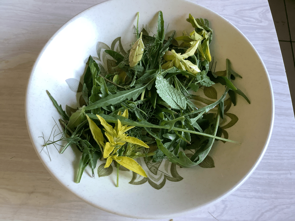 Earlier this week the Guardian featured an article on foraging for food. I do this occasionally in the wild – picking blackberries, sloes, and juniper berries – but more frequently in our garden. Whilst not a complete wilderness, I take a relaxed approach to weeding and encourage plants to seed where they will. Most lunches we have a salad from the garden being a mix of what ever I find: rocket, lambs lettuce and mustard are staples as they self seed and grow all year round; mint, sweet cecily, marjoram, and fennel; in the spring baby dandelion leaves; and in the summer nasturtium leaves and flowers.