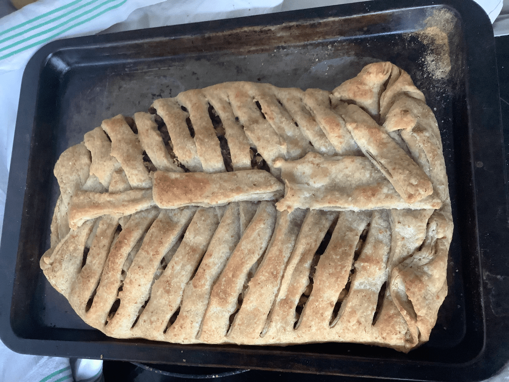 Filling made from a chopped onion, fried with garlic, to which I added about 250g of chopped mushrooms, flavoured with black pepper and rosemary. After a little more cooking, I added 100g each chick peas and chopped Brazil nuts. To add more flavour, I added a spoonful of quince jelly and some poppy seeds. Finally I added a couple of spoons of polenta to absorb any moisture, before laying the filling in the middle of the rolled out pastry. The edges of the pastry I cut into and plaited, before baking 30+ minutes at 200C.