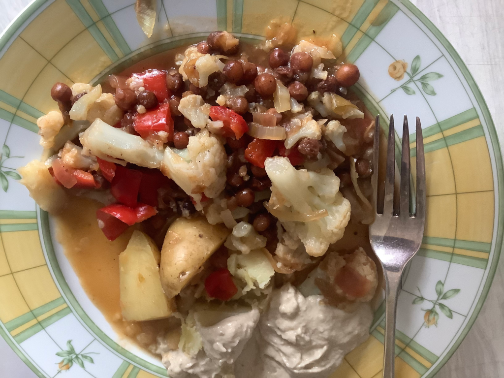 And last from the batch, red carlin peas. Using the last of the week’s OddBox, I fried onion, garlic and red pepper together and then added cooked potatoes and cauliflower, stirred a while before finally adding the drained peas and a couple of spoons of chutney. Here it is being served with baba ganoush.