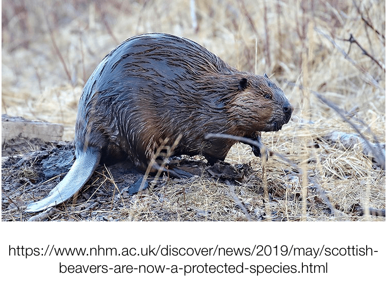 Reintroducing previously native species such as the beaver. Beavers are useful members of our natural ecosystem especially in shaping and managing rivers and preventing flooding. Beavers, hunted to extinction 400 years ago, have been reintroduced into the wild in about 20 locations across the UK.
