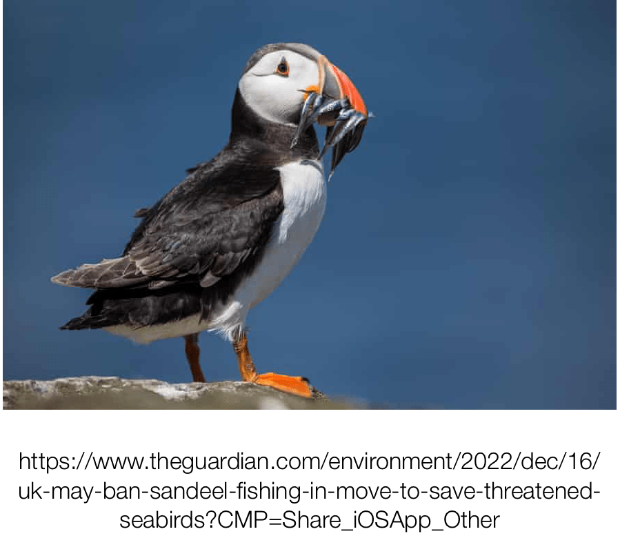 The Department for Environment, Food and Rural Affairs (Defra) is proposing to ban sand-eel fishing early next year, following consultation with relevant parties. Sand-eels that are dredged up from the sea bed are typically used as feed for animals or farmed salmon. However sand-eels are a key part of the diet of many sea birds including the kittiwake and the puffin, both of which need protecting as their numbers are unnaturally low.