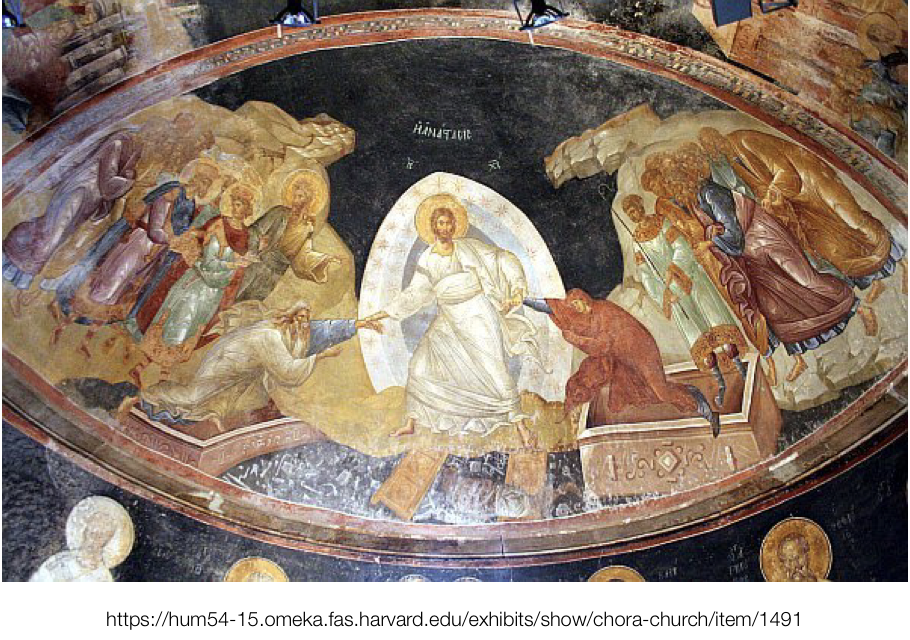 In Greek the word is ‘anastasis’ which is also the title used for pictures depicting Christ ‘harrowing hell’. Between his burial on Good Friday and the empty tomb on Easter morning, Jesus is believed to have gone to the place of the dead – variously known as hell or hades – where he triumphs over death as a force of dominion. In pictures Jesus is shown breaking open prison doors or coffin lids, and reaching out a hand to pull out or pull free those trapped by death. Typically it is Adam and Eve who are the first people that Jesus resurrects. This story is called ‘the harrowing of hell’