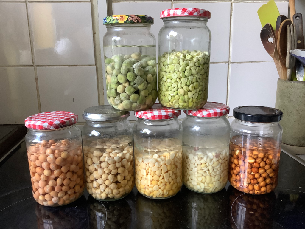 NB I weigh a daily portion of beans into a glass jar, add water and leave to soak. Then I place all the jars in a large pan, half fill with water and bring to the boil. Letting it simmer for 30 minutes before turning of the heat. This gives me 7 jars of ready cooked beans.