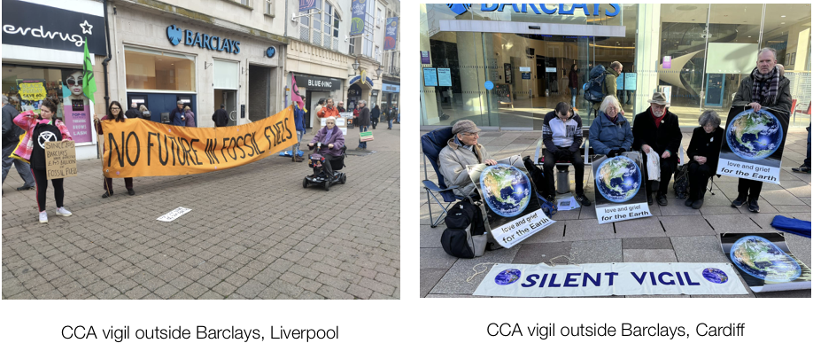 Actions taken by CCA include regular vigils held outside local branches of Barclays. This is done by local CCA groups often in conjunction with other groups concerned about justice and the environment. See CCA’s event page for more details – https://christianclimateaction.org/events/