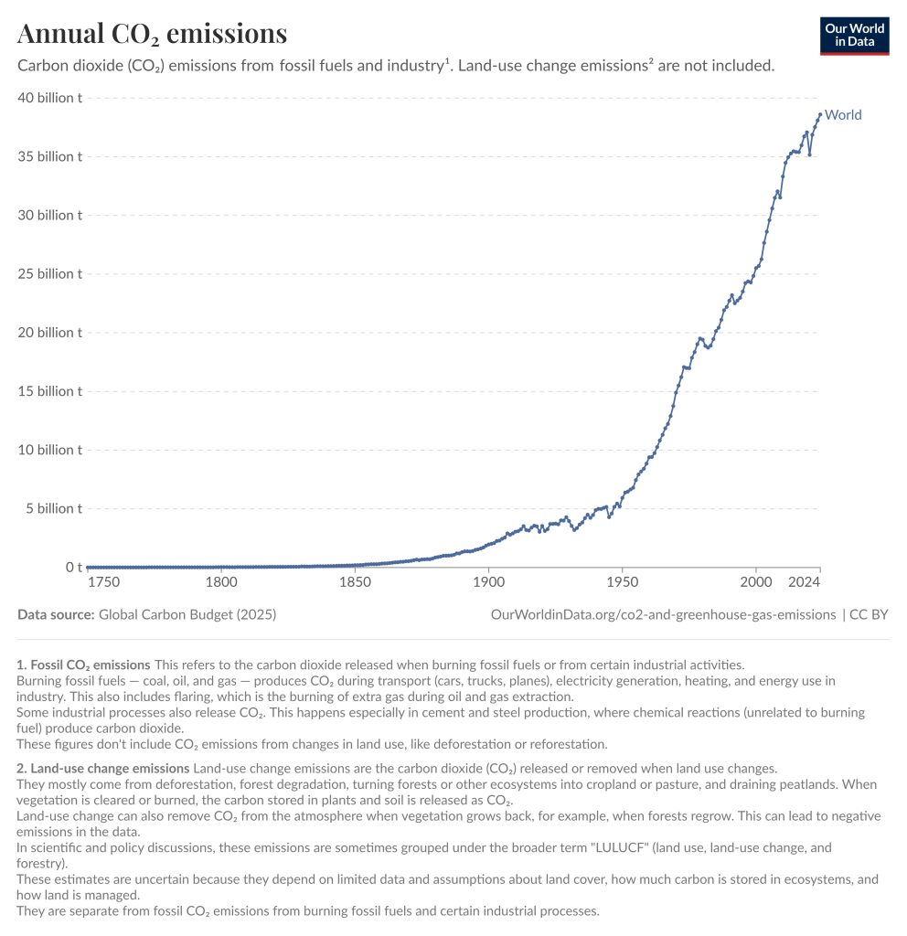 Once released into the atmosphere,  carbon dioxide remains there for centuries. So it is important to understand not just how much we emit each year, but also how much has already accumulated in the atmosphere and to which we are now adding. The chart below comes  from an article produced by Our