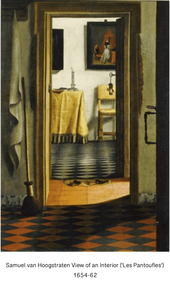 We are looking from one room to another, with a corridor in between. The first room is a kitchen or scullery – a mop and a towel suggest domestic tasks. The room beyond is more refined. A set of keys suggests a desire to protect the security of this room. On the table is an open book. By it is a large candle now extinguished; maybe the book was being read in the early hours before day break. There is an atmosphere of tranquility and peace about this scene, as well as a sense of patient waiting. Is the room waiting for the reader to return to the book?