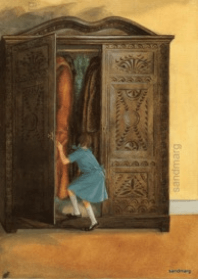 This first door is from The Lion, the Witch and the Wardrobe by C S Lewis. Lucy climbs in to hide and finds that the wardrobe leads into a parallel world, a world of challenge and adventure, fear and excitement. If we could choose to step through a door into another world this Advent, would we be hoping to step back into the world of childhood Christmases? A time when everything is exciting, the ground is always covered with snow, Christmas trees are tall and everyone is full of love and laughter. When we excitedly unwrap ribbons and paper to find we have been given our hearts desire.