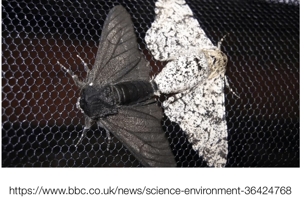 During the 19th century the peppered moth which typically had white wings peppered with grey, changed in appearance such that by the end of the century its wings were entirely black. The moth’s colouring was it camouflage, when resting on tree trunks or walls, preventing it from falling prey to the next hungry bird. But as industrialisation and its smuts changed the colour of walls and tree trunks, so it was that the darker variants of the moth were the ones that survived. Over the century the peppered moth became an insect with largely black wings. (Since the Clean Air Acts of the 1960s the colouring of these moths has again been subtly changing). A