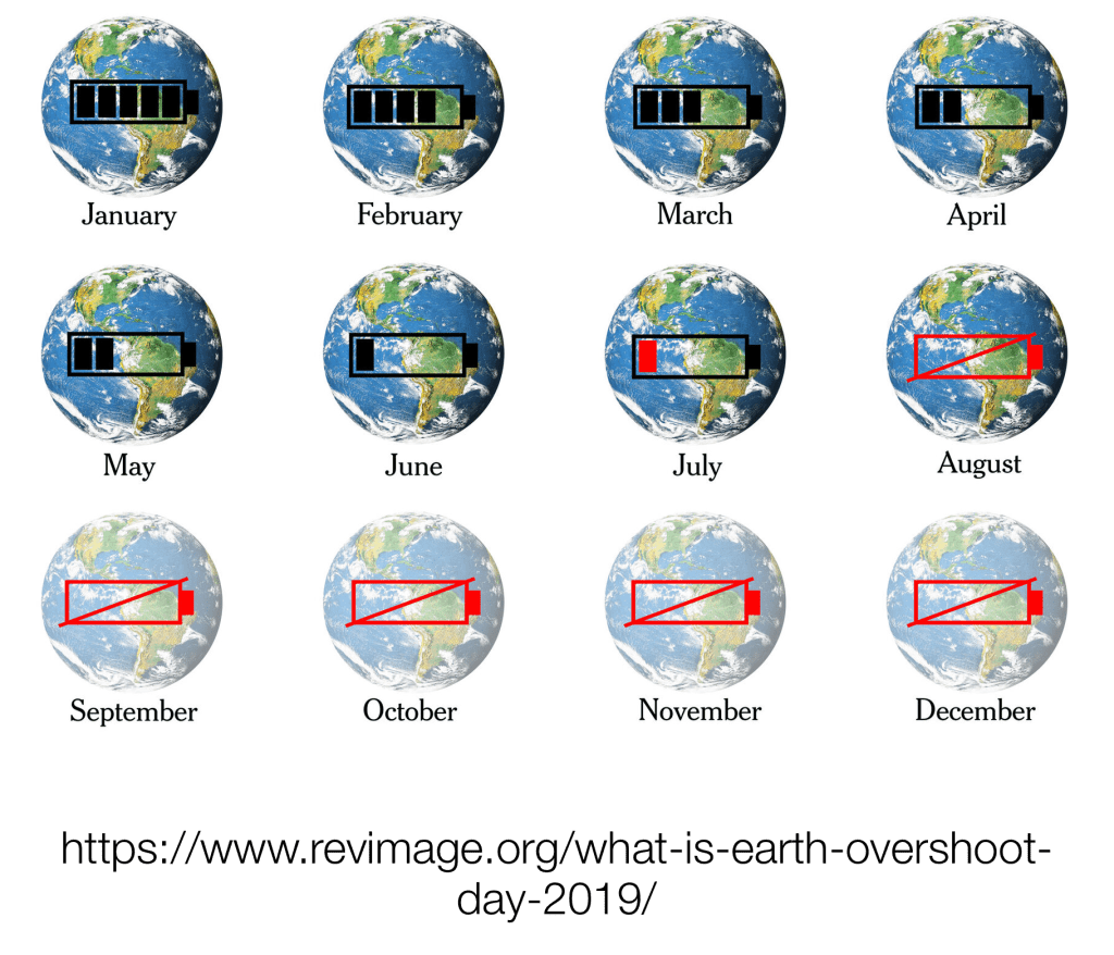 Ideally what we consume from the natural world – crops, timber, drinking water, clean air, energy – is balanced by the earth’s ability to regenerate. Prior to 1970 that was the case. Since then we have been using up the earth’s renewable resources at a rate faster than they are replenished. Scientists each year calculate that point when we pass from credit to deficit. This is called Earth Overshoot Day. This year the predicted date is 28th July. Seven months into the year and we have already – globally – consumed as much as the earth can replenish in one year!